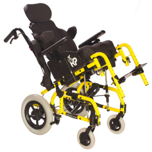 Niño con dificultad para moverse, que es cuidado por sus padres o un cuidador y necesita soportes, basculación y reclinación para estar sentado.